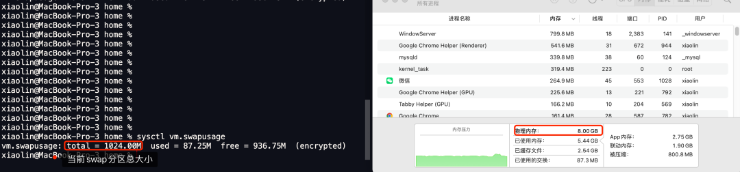我用我的 mac book pro 笔记本做测试,我的笔记本是 64 位操作系统,物理内存是 8 GB, 目前 Swap 分区大小为 1 GB(注意这个大小不是固定不变的,Swap 分区总大小是会动态变化的,当没有使用 Swap 分区时,Swap 分区总大小是 0;当使用了 Swap 分区,Swap 分区总大小会增加至 1 GB;当 Swap 分区已使用的大小超过 1 GB 时;Swap 分区总大小就会增加到至 2 GB;当 Swap 分区已使用的大小超过 2 GB 时;Swap 分区总大小就增加至 3GB,如此往复。这个估计是 macos 自己实现的,Linux 的分区则是固定大小的,Swap 分区不会根据使用情况而自动增长)。