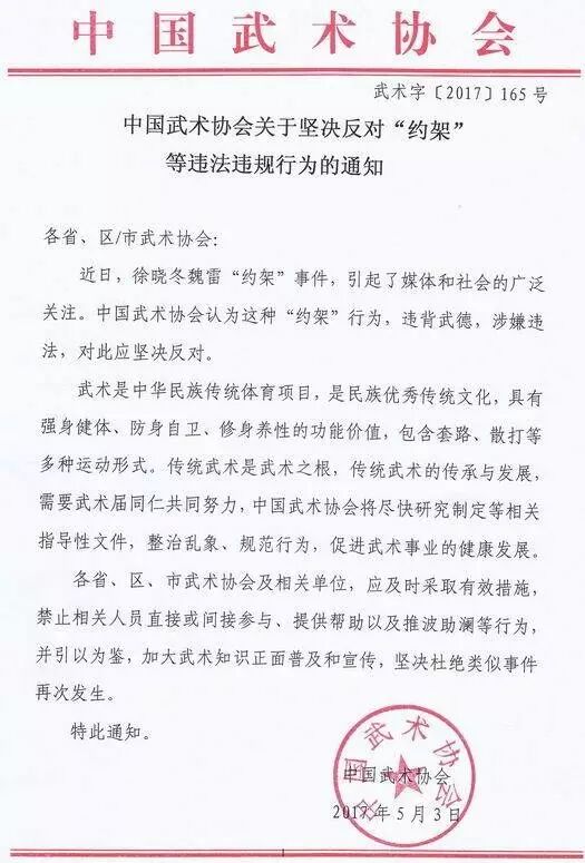 中国武术协会也发表声明称,约架涉嫌违法,应坚决反对。陈家沟的挑战与应战,