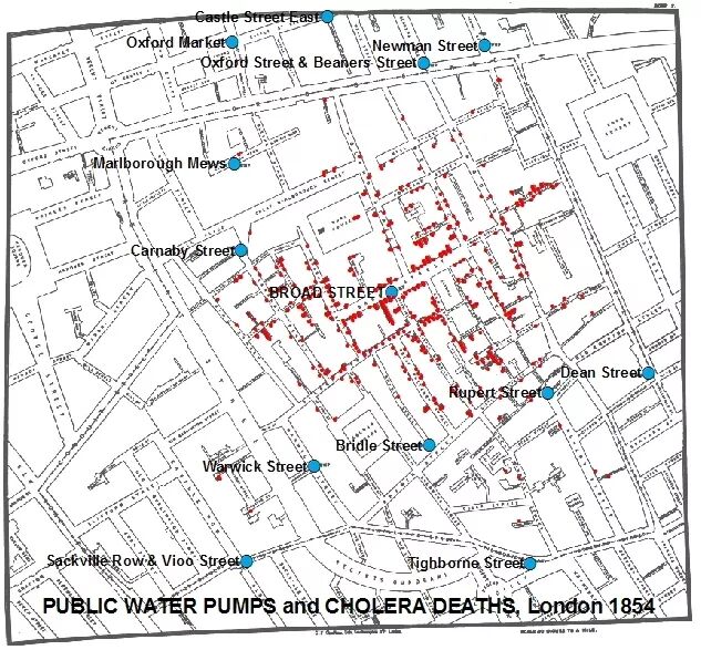 约翰·斯诺发现几乎所有的死亡病例都发生在宽街(Broad Street)的公共水泵附近,在进一步调查中,他发现除了饮用宽街公共水泵的居民外,伦敦其他地方,霍乱并没有明显爆发。