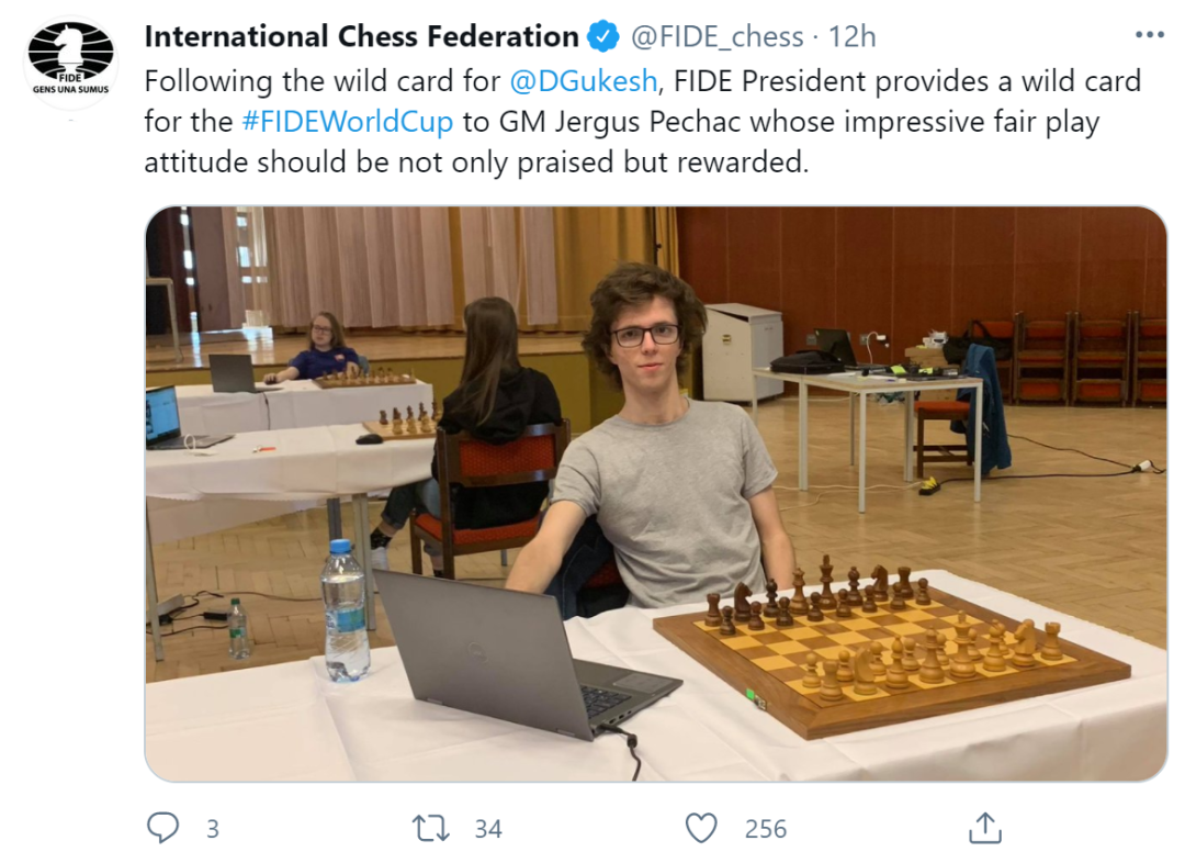 佩哈奇凭借2021国际棋联世界杯赛欧洲区资格赛所展现的公平竞赛行为,赢得了评委们的投票!