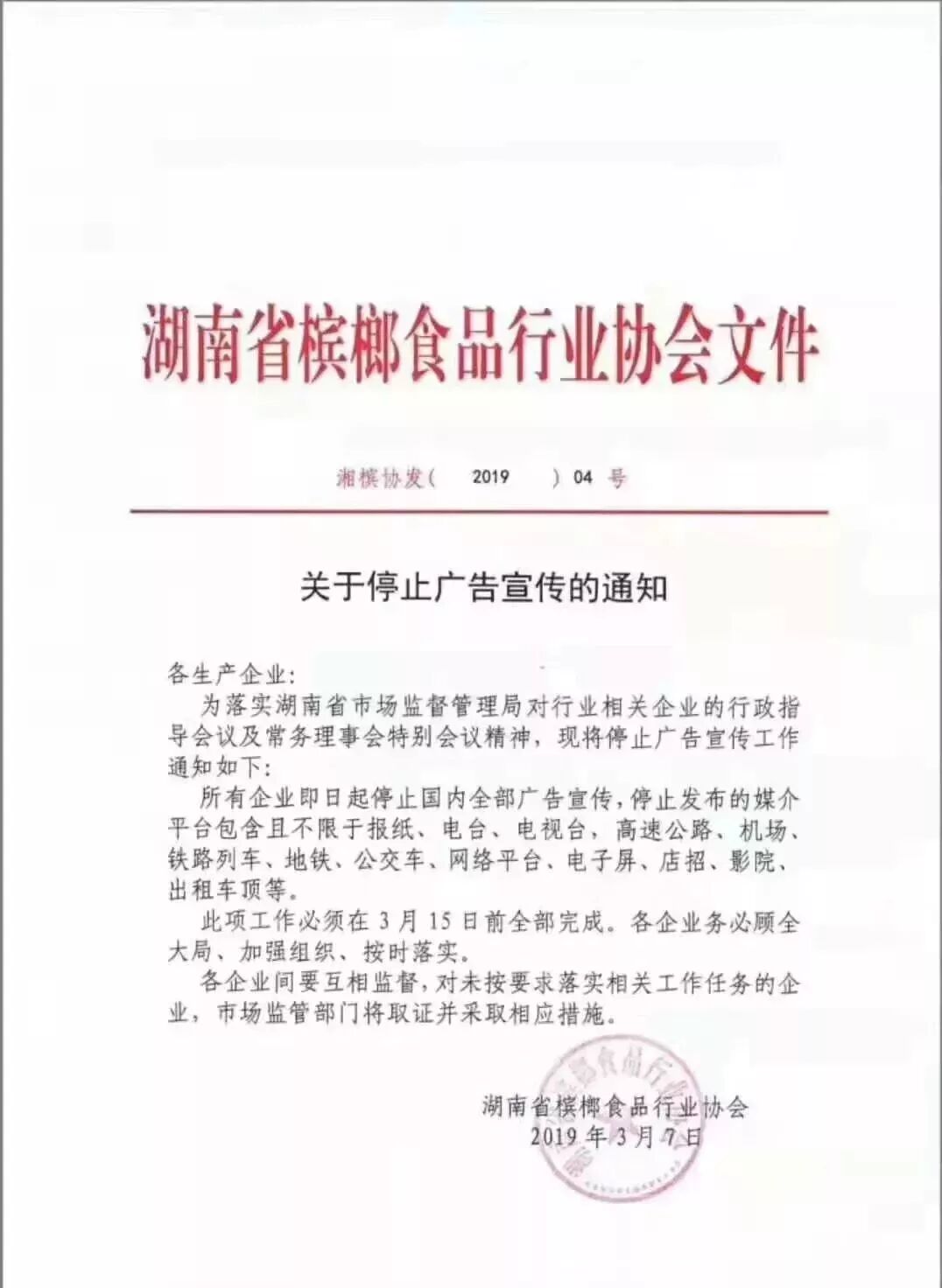 但这一次,槟榔似乎在劫难逃。一份湖南省槟榔食品行业协会下发的《关于停止广告宣传的通知》最近被传播得很广。这份文件称,湖南所有槟榔生产企业即日起停止国内全部广告宣传,且此项工作必须在 3 月 15 日前全部完成。
