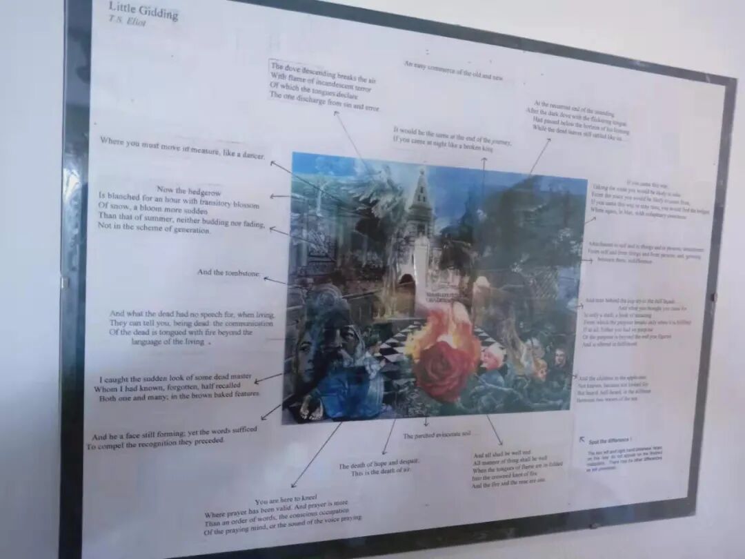 花两英磅买了一壶咖啡,透过落地窗望着明媚阳光下树丛中的小吉丁教堂。休息室的墙上有根据长诗《小吉丁》所绘的一幅彩画,上有摘录的诗句,有“国王”“鸽子”“火”等关键词以及示意图,看这张图可了解全诗大致思路。一边喝咖啡一边研究那张解析图,我发现,长诗《小吉丁》其实可以称得上一部微缩版的《神曲》。联想小教堂门楣上那关于天堂之门的铭刻,顿然觉得此时此刻站立之处,正是整个英格兰的拐角,正是时间的枢纽。