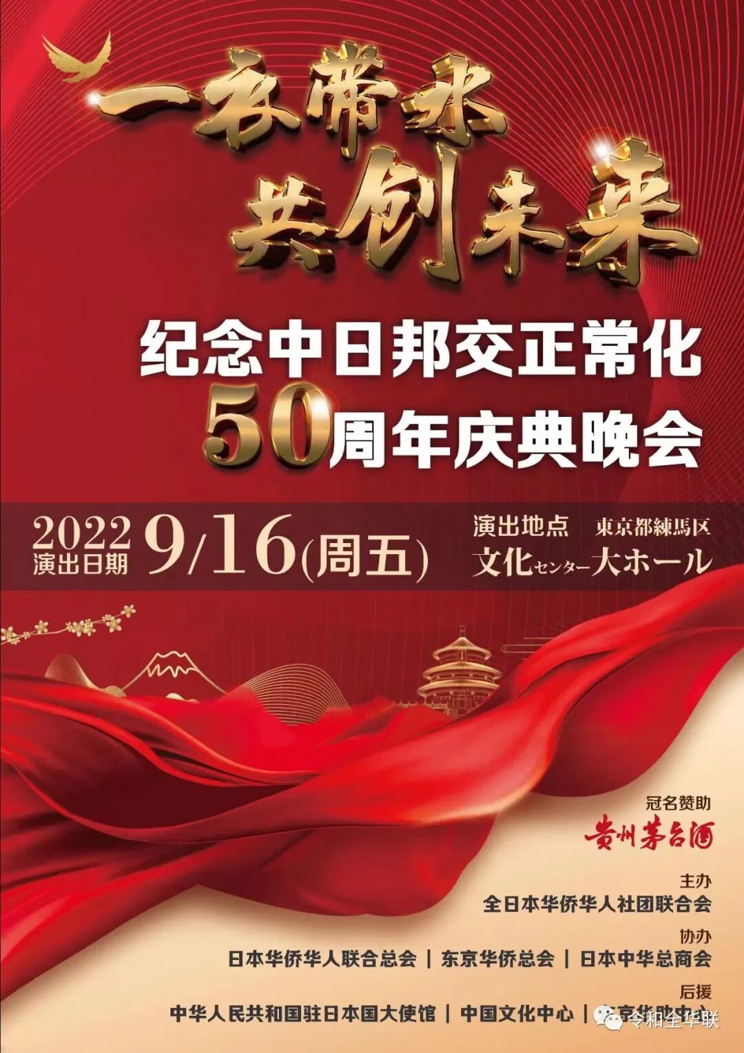 为纪念中日邦交正常化50周年,由全日本华侨华人社团联合会主办,中华人民共和国驻日本国大使馆等后援,由贵州茅台酒冠名赞助的“一衣带水 共创未来”纪念中日邦交正常化50周年庆典晚会,将于2022年9月16日于东京练马区文化中心举行。