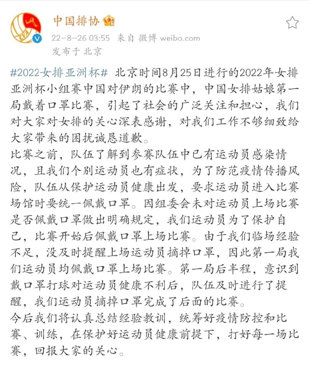 而中国排协也在今天凌晨通过社交平台对这件事情做出了解释和道歉。
