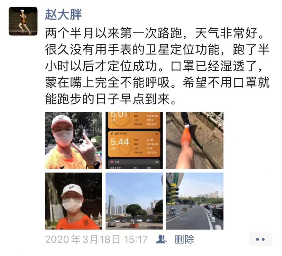 2020年3月18日,我们小区解封了,当时重庆还没有明文规定说户外可以取下口罩,我于是戴着口罩去户外跑了一次步。