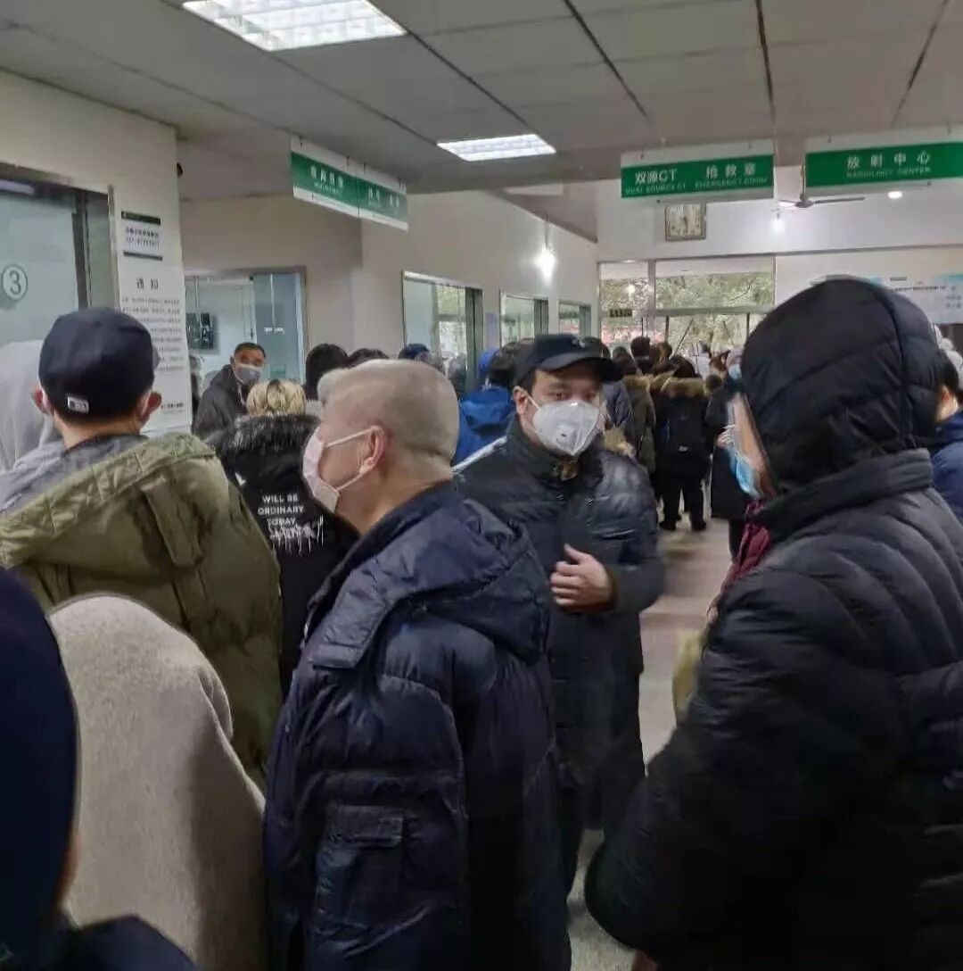 捱到了昨天(1月22日)早上,越来越严重。我赶紧叫了出租车让他们去了汉口医院。我妈一进医院就拍了个视频给我,在发热门诊排队的人已有几百个。因为人实在太多了,中途他们又打车去了另一家非定点医院,想先去拍个片看一下。片子一出来,双肺全部感染,片子上已从第一次检查的几个阴影点发展成大片的阴影。