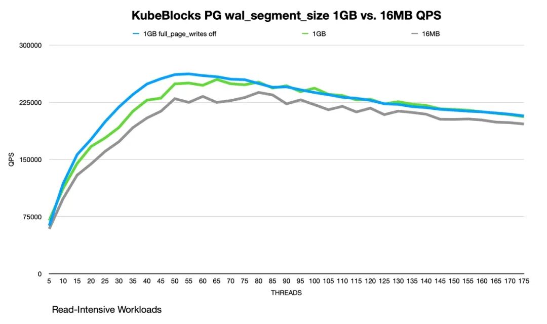 可以看出,在开启 full_page_write 时 1GB segment 比 16MB segment 表现要略好,也印证了通过增加 segment size 降低加锁频率的方案可行;关闭 full_page_write 后 PG 表现非常顺滑。