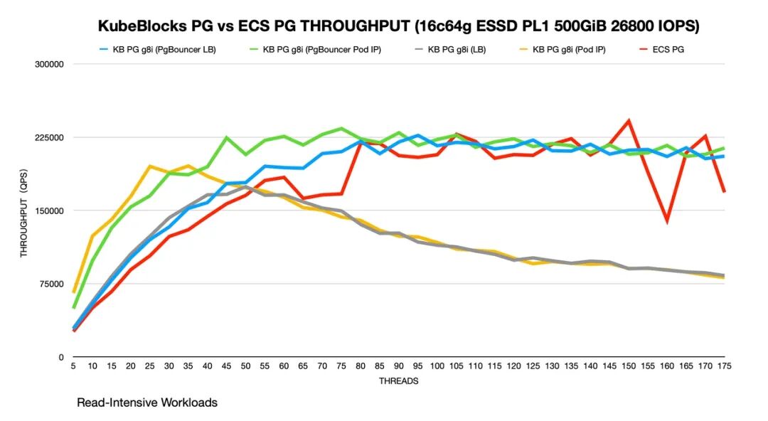 不过根据以往的经验,PG 因为是进程模型,一个会话对应一个进程,当并发数比较高的时候,页表和进程上下文切换的代价会比较高,所以又引入了 pgBouncer;用户自建 ECS PG 为了解决并发问题,开启了 Huge Page,KubeBlocks PG 因为部署在 ACK 上,所以没有开启 Huge Page。