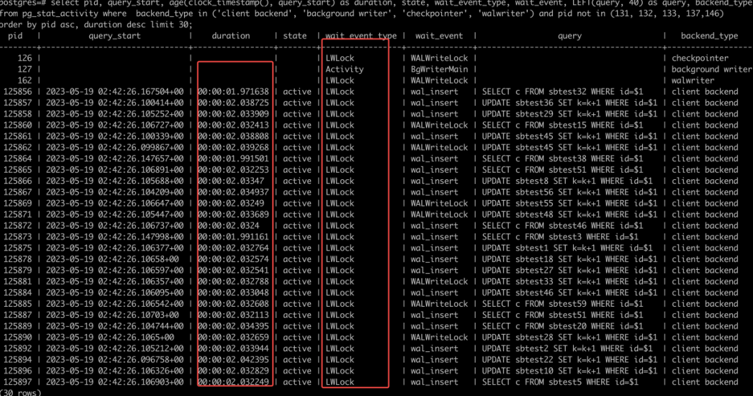 2023-05-22 11:56:08.355 GMT,,,442907,"100.127.12.1:23928",646b5858.6c21b,1,"",2023-05-22 11:56:08 GMT,,0,LOG,08006,"could not receive data from client: Connection reset by peer",,,,,,,,,"" 2023-05-22 11:56:10.427 GMT,,,442925,"100.127.12.1:38942",646b585a.6c22d,1,"",2023-05-22 11:56:10 GMT,,0,LOG,08006,"could not receive data from client: Connection reset by peer",,,,,,,,,"" 2023-05-22 11:56:12.118 GMT,,,442932,"100.127.13.2:41985",646b585c.6c234,1,"",2023-05-22 11:56:12 GMT,,0,LOG,08006,"could not receive data from client: Connection reset by peer",,,,,,,,,"" 2023-05-22 11:56:13.401 GMT,"postgres","pgbenchtest",3549,"::1:45862",646ae5d3.ddd,3430,"UPDATE waiting",2023-05-22 03:47:31 GMT,15/95980531,1420084298,LOG,00000,"process 3549 still waiting for ShareLock on transac tion 1420065380 after 1000.051 ms","Process holding the lock: 3588. Wait queue: 3549.",,,,"while updating tuple (60702,39) in relation ""sbtest44""","UPDATE sbtest44 SET k=k+1 WHERE id=$1",,,""通过对比日志发现每次 WAL segment 耗时较长时,客户端就会产生一批慢查询(>1s)日志 PG 内核中清零的具体实现为:
