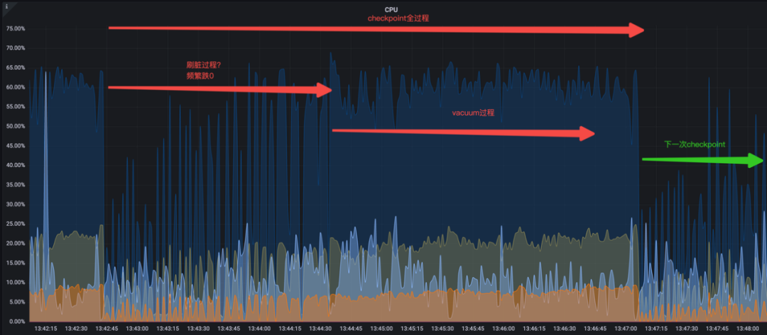 2023-05-23 02:27:54.215 GMT,"postgres","pgbenchtest",1301759,"::1:56066",646c1ef3.13dcff,58,"SELECT",2023-05-23 02:03:31 GMT,43/198458539,0,LOG,00000,"duration: 1346.558 ms execute sbstmt-13047857631771152290: SEL ECT c FROM sbtest39 WHERE id=$1","parameters: $1 = '1001713'",,,,,,,,""至此基本可以确定 Checkpoint 时 TPS 跌 0、CPU 抖动和 WAL 清零有关,具体传导机制是: