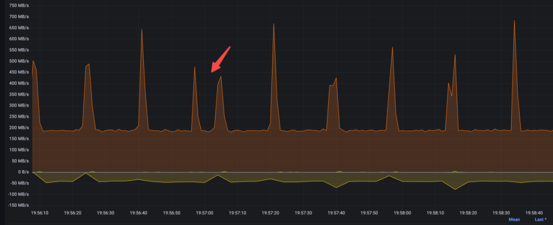 再一次压测,发现跌 0 的时候有一次比较大的内存回收,内存一次性被回收了 10GB,这个量有点大,在不开 Huge Page 的时候,一个 page frame 4KB,10GB 大概是 2.5MB 的 page 数量,大量 page 的遍历和回收对 os kernel page reclaim 模块会有很大的压力,而且在那个时间点上 os 卡了几十秒,导致上面的进程也都 hang 住,这种回收一般和 dirty_background_ratio 设置不合理有关,具体原理不再赘述。