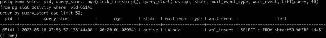 2023-05-18 05:44:20.693 GMT,"sysbenchrole","pgbenchtest",65145,"::1:43964",6465928f.fe79,1178,"SELECT",2023-05-18 02:50:55 GMT,48/45617265,0,LOG,00000,"duration: 1942.633 ms execute sbstmt-1652152656-473838068: SE LECT c FROM sbtest37 WHERE id=$1","parameters: $1 = '1007844'",,,,,,,,""13:45:41 开始做 vacuum。