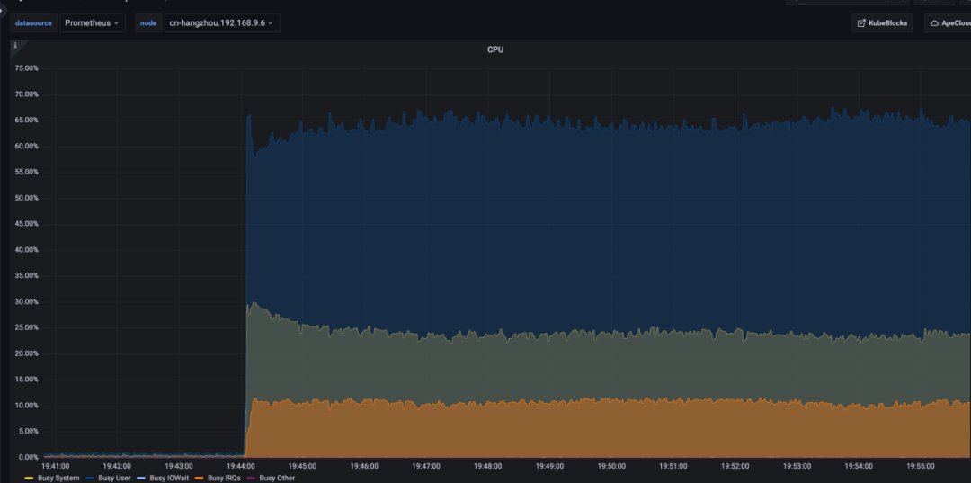 在不断增加磁盘带宽的过程中发现 TPS 跌 0 的现象得到缓解,因此针对这个发现一次性把磁盘带宽调到最高,换成 ESSD PL2 1TB 磁盘,对应带宽 620MB,从图上看抖动依然存在,但得到很大缓解,CPU 使用率跌幅收窄。