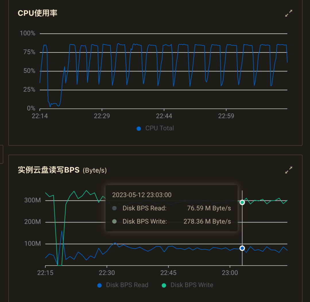 由于之前磁盘带宽到达了上限,所以针对 IO 带宽又加了一组测试,测试 500GB 磁盘的表现情况,500GB 磁盘对应的带宽为 min{120+0.5*500, 350} = 350MB,压测过程中发现在磁盘跑满的时候,CPU 依然有锯齿状波动,根据以往经验,这种抖动可能和 checkpoint 有关,但是也不至于到跌 0 的地步。