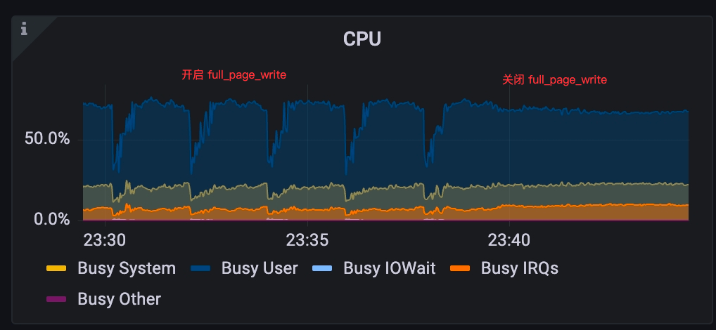 可以看出 IO 争抢对 PG 的影响很大,而且在关闭 full_page_write 之后即使有 Checkpoint,CPU 也几乎没有抖动。