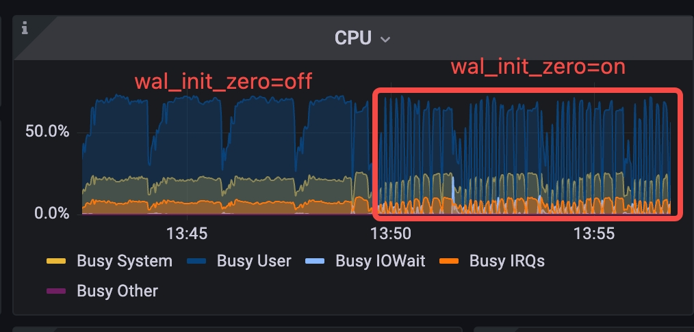 清零的最大问题是会产生大量 IO,并且需要所有事务挂起等待清零数据 sync 完成,直到新的 WAL 文件 ready,在这个过程中所有事务都要等待 WALWrite 和 wal_insert 锁,这是抖动的最大根源。不过问题的本质还是 IO 争抢,如果 IO 负载很低,清零速度比较快,观测到的抖动也不明显,问题也不会暴露,目前观测到的剧烈抖动也只出现在压测过程中,所以前面几轮测试中放大 IO 带宽也有助于缓解 TPS 跌 0 和 CPU 抖动。