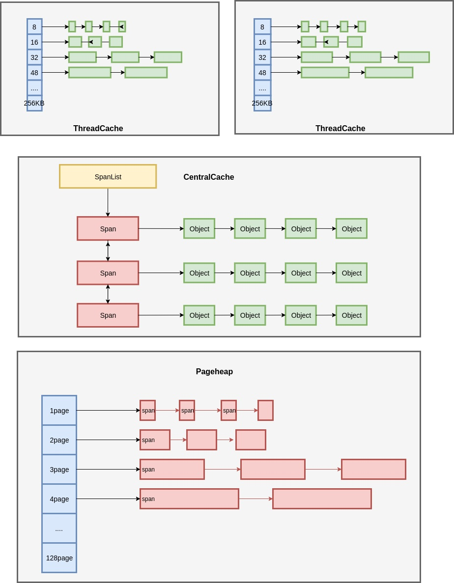 其中使用的就是内存池技术。如果想了解 tcmalloc 的细节,盗一张图解 TCMalloc中比较经典的结构图:
