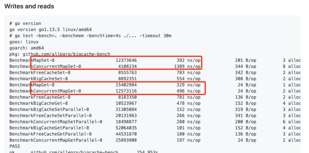 2020-05-09 补充:多位同学也提到了,bigcache 这个测试并不公平。查了下 issues,map+lock 和 sync.Map 的有人做过测试,性能确实低一些(单锁的情况) https://github.com/golang/go/issues/28938#issuecomment-441737879