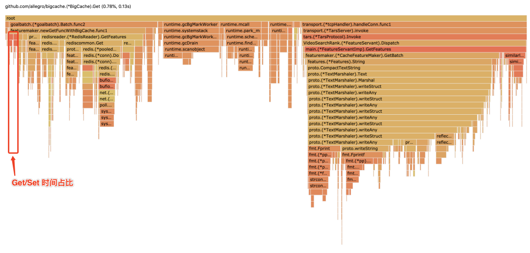 例如无极(腾讯内部的一个配置服务)这类配置服务(或其他高频数据查询场景),往往需要 Get(key) 获取对应的结构化数据。而从 BigCache,CPU 消耗发现(如图),相比网络 IO 和 Protobuf 解析,Get 占用0.78%、Set 占用0.9%,基本可以忽略: