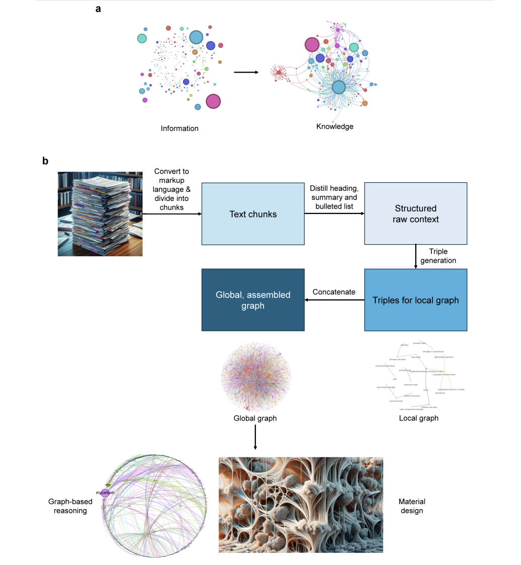 上图展示了一个将信息转化为知识的方法。a面板强调了将容易获取的信息(如回答“谁”、“什么”、“在哪里”和“何时”)转化为更难以传达和转移的知识(即“如何”)。b面板说明了解决这一问题的过程:首先将科学文章转换成标记语言,然后分解成文本块,这些文本块用于提炼出简洁的科学摘要。这些原始内容进一步用于生成图的三元组,最初在每个文本块层面上创建,然后通过串联所有局部图来构建一个全局图。