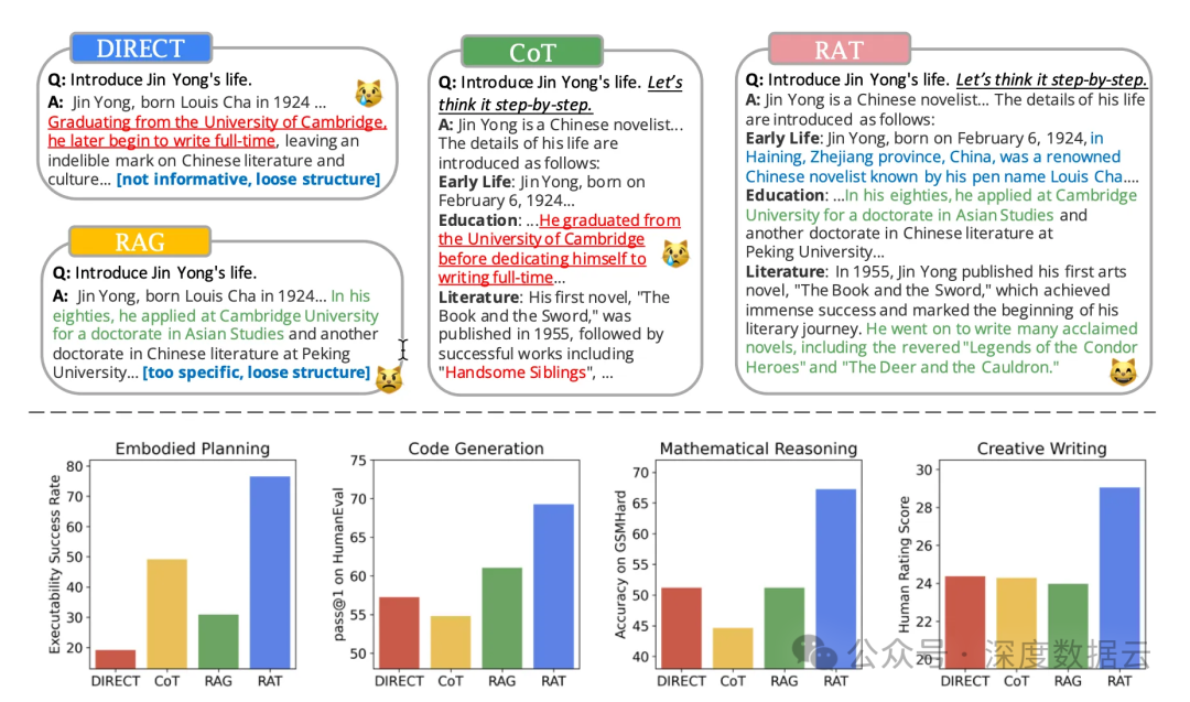 RAT作为RAG和CoT的有机结合,其将思考作为查询(Thoughts as Queries),并通过逐步修正思考和生成响应的方式进行操作。RAT是一种Zero-Shot提示方法,拥有明显的优势,尤其在传统的CoT提示、RAG以及其他基线方法所面临的挑战中表现突出。这种方法在挑战性代码生成、数学推理、任务规划以及创意写作等方面都取得了显著的成果。