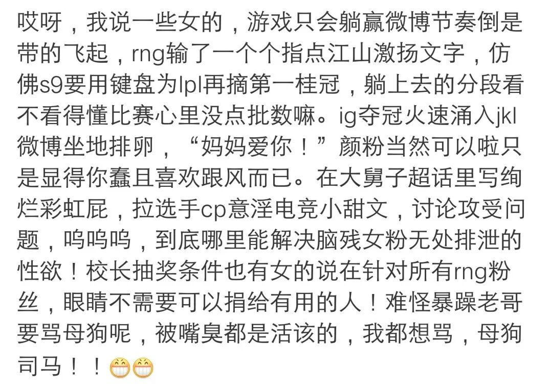 整体而言,几年前电竞圈的讨论氛围,暴躁与诙谐并存。赢了狂吹,输了狂骂是常态,这个以男性青年为主体的圈子,保持着犀利且粗俗的语言风格,并成为了“电竞文化”中重要的组成部分。