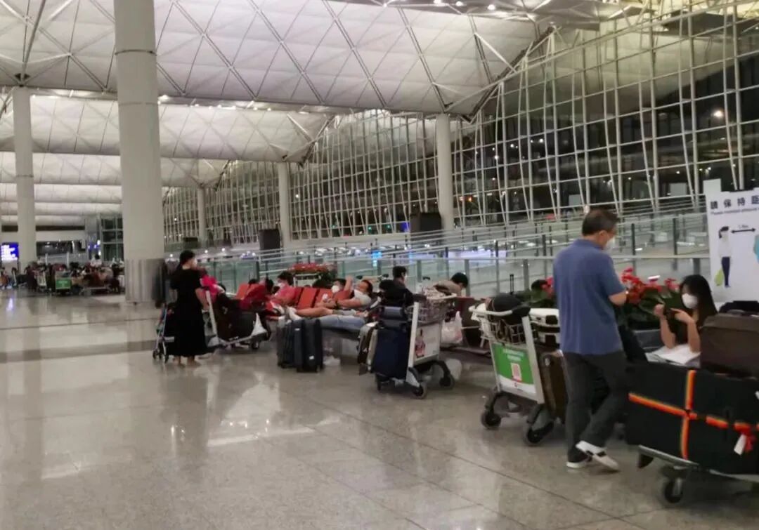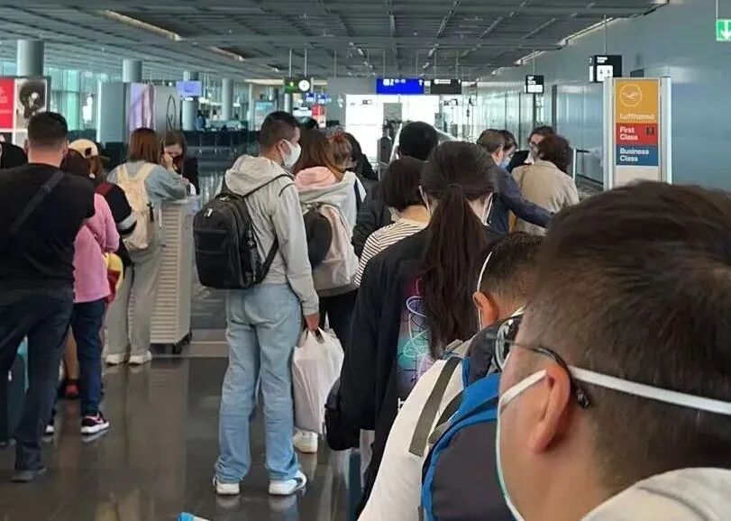根据中国民航局公开数据,自2020年6月实施国际航班熔断政策以来,截至今年5月23日,累计执行熔断措施727次,减少入境客运航班1679班。其中,今年以来,实施熔断312次,减少客运航班768班。大量的国际航班熔断,海外回国机票价格的大幅上涨,使得处在毕业季的留学生一票难求;而即便幸运地避开了熔断,在起飞前他们可能也会因航空公司超售而被“踢”。从5月初开始,越来越多的海外留学生“开辟”了另一种方式回国——经香港回中国内地。随着香港第五波疫情缓和,特区政府宣布,5月1日起容许非香港居民从海外地区入境香港,调整个别航线“熔断机制”,并在机场“检测待行”中额外加入快速抗原测试。香港放宽入境限制第29天,香港入境署公布的数据显示,当天从机场入境的内地访客首次破千。比较放宽前后内地游客经机场入境人数,从4月日均9人,增至6月日均1008人。自5月1日至发稿前,经香港机场入境的内地访客多达60324人。对于海外留学生而言,经香港回中国内地这条路并没有想象中那么顺利,甚至发生了一定程度上的“堵塞”。随着入境香港人数的增加,香港检疫和通关资源愈发紧张,留学生们在这里要经历第二轮等待。刘夏在法兰克福机场排队登机,她要先飞往香港再回内地今年2月,家人通知在法国留学的李佳欣,外婆离世了。她从小被外婆带大,听到消息后立刻决定暑假回家给外婆上坟,并买了考试结束后第二天的航班——5月15日,从巴黎直飞上海。4月底,李佳欣发现航班因收到熔断指令被取消。思考再三, 她还是决定要回国。5月9日,李佳欣在网上看到一则贴文。一位定居在美国的华人,因留在国内的家人生病想回国,恰逢香港特区政府调整防疫政策,所以尝试经由香港中转回内地。李佳欣也开始在网上搜索相关的信息。她发现,随着香港第五波疫情缓和,特区政府宣布,5月1日起允许非香港居民从海外地区入境香港,调整个别航线“熔断机制”,并在机场“检测待行”中额外加入快速抗原测试。8天后,当她看到上述贴文中的华人已顺利返回内地的消息时,她下决心也要走这条路,并在一些从海外经香港回内地的帖子下留言或私聊发帖人。其中一名网友把她拉进一个微信群,成员都是准备从香港转机的海外华人,他们在里面互相分享转机经验。按照香港特区政府规定,入境香港需持有起飞前48小时核酸检测阴性结果、疫苗接种证明和7天集中隔离酒店预订单。李佳欣逐一搜索香港特区政府指定的第七轮检疫酒店。她发现,5月底,第七轮指定检疫酒店名单上的66家酒店里,只剩2家酒店有空房,且显示房源紧张。她选择了相对便宜的丽豪航天城酒店,预定5月28日入住,并购买了能在那一天落地香港的机票,期间她需要先从法国中转到土耳其,再从土耳其飞往香港。香港特区政府也有相关的熔断机制。抵港航班若有五名或以上乘客,或全机乘客总数5%以上经抵港检测确诊新冠肺炎,相关航空公司从同一地点抵港的民航客机航线将禁止着陆香港5天。由于经历过一次直飞国内的航班熔断,李佳欣每天都会在香港政府官网查询最新的航班熔断名单。5月24日,起飞前72小时,李佳欣发现,此前购买的从土耳其飞香港的航班触发熔断机制,香港卫生署禁止土耳其航空运营的客机在5月24日至28日期间从伊斯坦布尔着陆香港。她立刻打给土耳其航空的客服,客服说最快只能改到6月3日的航班。她尝试跟隔离酒店协商,把入住日期顺延到6月3日之后,但酒店既没有接听电话,也没有回复邮件。因为担心酒店不能退款(虽然她在酒店官网看到,若因航班熔断不能按时抵达的,可以退款),近一万元的房费会打水漂,李佳欣当天重新买了阿联酋航空的机票,如果一切顺利,她能在28号按原计划入住预定好的香港检疫酒店。次日,航班熔断名单上又出现了她购买的阿联酋航空。这次,她找不到能在28号抵港的机票了。她重新翻阅隔离酒店的预订情况,一个个确定后面的日期里有无空房,但她发现在每一个选择的日期下,都显示无房。为了回国,李佳欣开始琢磨其他的中转地。