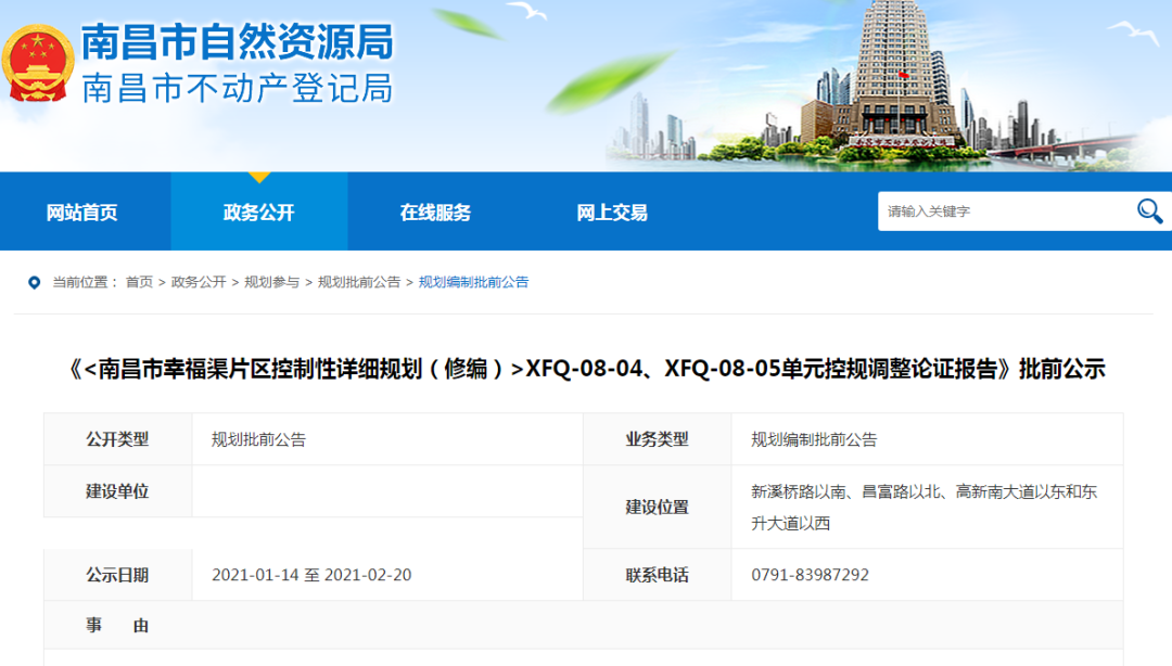 在2021年1月15日,南昌市自然资源局公示了《<南昌市幸福渠片区控制性详细规划(修编)>XFQ-08-04、XFQ-08-05单元控规调整论证报告》,此次调整地块位置位于青山湖区新溪桥路以南、昌富路以北、高新南大道以东和东升大道以西。此次调整重新界定了土地开发范围和重新设定了用地功能。据了解,该片区大部分范围位于青山湖区石桥村。
