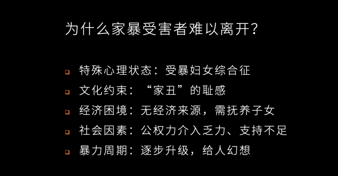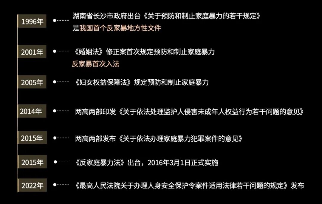 可见,人身安全保护令是受害人获得人身安全保护的一道防火墙。同时它也会对离婚案件的审理起到非常积极的推动作用。所以我们在2016年3月1号《反家暴法》实施当天,帮助冬梅申请了人身安全保护令。由于这是北京市首个人身安全保护令,法官非常地慎重,直到14天后才签发,而且是以“有家暴的现实危险性”作为事由签发的,并没有直接认定田强构成家暴。这也为下一步我们处理冬梅离婚案件增加了一定难度。很快就到庭审阶段了。果不其然,田强对他的家暴行为全部予以否认,而且对所有的证据都不认可。尽管我们的律师为收集相关证据尽了很大的努力,但是从当时法官的态度来看,要认定可以直接判离婚的家庭暴力是非常困难的。因此要离婚,不能协议离婚,只能调解离婚。在调解的过程当中,田强提出了苛刻的条件:首先,他要三岁儿子的抚养权;第二,他要绝大部分的夫妻共同财产。冬梅都答应了。我当时很着急,我说:“冬梅,没有关系,我们没有必要在财产和子女抚养上作出妥协。即使第一次不判离,半年后还是可以离婚的。”但是冬梅跟我说:“李老师,别说半年,我一天都忍不了。我愿意接受这些条件,只要能够离婚。”因为冬梅的妥协和让步,法庭在庭审当天就出具了离婚调解书。看到冬梅在拿到离婚调解书后的释然,我和我的同事们也很高兴,我们祝福她终于可以开始新的生活。但是没有想到,反转来得非常快。大概在收到离婚调解书后半个月,冬梅的女儿突然哭着给我的同事打电话,说冬梅回到了田强身边。我听到以后特别着急,非常担心冬梅的人身安全,所以想方设法联系到了冬梅。我通过微信视频联系上了她,是田强接的。在视频里面,我看见冬梅坐在板凳上洗衣服,没有抬头。她跟我说,小儿子生病了,天天哭着喊要妈妈,她不能不管。看到这样一个情况,我知道冬梅心意已决。我就跟田强说,希望你珍惜冬梅,如果你再家暴,我们跟你追究到底。田强一下子就把电话挂了,而且把我拉黑了。看到这个情形,我们年轻的同事当时就哭了。在过去的40天里,她陪冬梅出庭,陪冬梅做人流,陪冬梅哭,陪冬梅笑。她跟我说,李老师,我连轴工作了40天,没有想到又回到了原点。我安慰她说,我们没有回到原点,因为他们双方的地位已经发生了变化。冬梅知道她背后有我们,田强也知道冬梅的背后有我们。在为冬梅的遭遇唏嘘的同时,我们确实要问,为什么家暴受害人难以离开?首先,长期遭受家暴的女性有一种特殊的心理状态,叫受暴妇女综合征。受暴妇女综合征最重要的一个特点就是习得性无助。有受暴妇女综合征的受害人会长期处在一种恐惧焦虑的状态,她的内心是瘫痪的,她没有自信也没有勇气离开暴力环境。此外还有客观的困境,比如文化的约束。家丑不可外扬,很多人认为家暴是“家丑”,会产生耻感;或者担心离婚后子女因为单亲家庭而受到歧视。这些都让她们面临着很大的阻碍。第二是经济困境,很多受暴人收入不高,甚至没有收入,没有办法单独抚养子女。此外还有社会因素,比如公权力介入乏力,社会支持系统不足,让我们的受害人有一种“拔剑四顾心茫然”的无助感和孤独感。此外,家暴的特征之一就是它存在暴力周期。所谓的暴力周期有两重特点:其一,家庭暴力往往会逐步升级,越来越严重;其二,这种暴力并不是从始至终都是一样的,而是会有三个周期——蜜月期、矛盾聚集期、暴力爆发期。在蜜月期的时候,施暴人会给受害人买小礼物,会认错,会送花。这会给受害人带来幻想,认为施暴人还是爱自己的,施暴人是可以改的。这种幻想也让她们很难离开暴力环境。据相关研究显示,受害人平均要有7次的反复,才有可能彻底地摆脱暴力关系。这是多么艰难!家庭暴力就像黑洞,它吸走了受害人所有的勇气、力量、信心。在我办理的案件当中,最长的是受害人遭受了40年家暴依然没有办法摆脱。所以我们看到,家庭暴力的本质就是权力控制。施暴人通过暴力让受害人对他臣服,听命于他。家庭暴力往往只始于一次推搡或者一次谩骂;如果第一次我们没有有效地应对的话,未来可能会有无数次。家庭暴力没有易发人群,任何人都有可能成为家暴的对象。为了让家暴受害者摆脱糟糕的暴力关系,我们国家的法律也在不断完善。早在1996年,湖南省长沙市就出台了我们国家首个反家暴的规范性文件——《关于预防和制止家庭暴力的若干规定》。2001年,《婚姻法》修正案首次规定预防和制止家庭暴力。这也是反家暴首次写入法律。2005年,《妇女权益保障法》规定预防和制止家庭暴力。2014年,两高两部印发了《关于依法处理监护人侵害未成年人权益行为若干问题的意见》,这是对未成年人家庭暴力受害人的特殊保护。2015年,两高两部发布《关于依法办理家庭暴力犯罪案件的意见》。这是针对家庭暴力刑事犯罪非常完善、细化的规定。2015年,我们的《反家暴法》出台,并于2016年3月1号正式实施。这也是我们国家反家庭暴力法制化进程的一个里程碑事件。在2022年,最高人民法院出台了《关于办理人身安全保护令案件适用法律若干问题的规定》。这个规定首先扩大了保护对象,包括前配偶、恋爱关系,都被纳入到了家庭暴力的保护范畴;其次,它降低了保护的门槛,降低了证明标准;第三,它增加了保护的内容,给受害人提供了更强有力的支撑。我下面给大家分享第二个故事