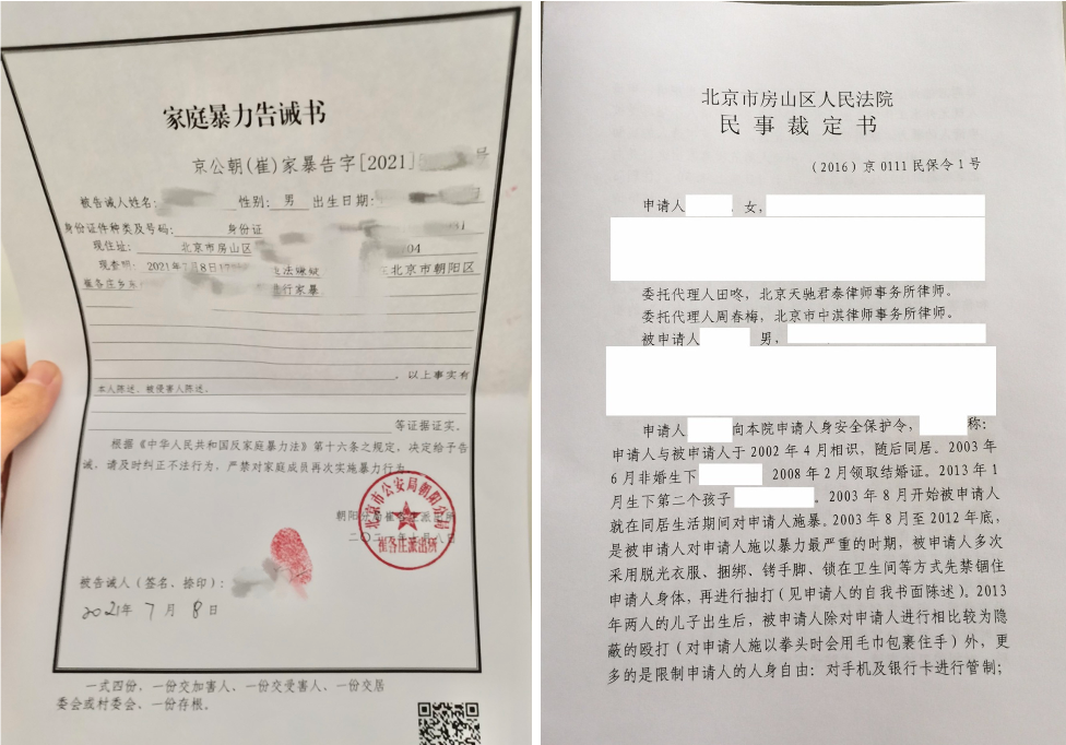 冬梅是80后,从小在单亲家庭长大。在遇到田强以后,田强如父如兄的照顾让冬梅体会到了久违的安全感。所以当田强跟她说,“不要毕业证了,跟我出来赚钱吧,我给你一个家”,冬梅就毅然放弃了还有一个星期就能拿到的毕业证,跟田强来到了北京。但是田强并没有像他所说的那样,让冬梅成为他的妻子,他们只是同居。不久以后,冬梅怀孕了。在冬梅怀孕4个月的时候,田强第一次对冬梅实施家暴;此后再也没有停止过,而且下手越来越重。在长期遭受家暴之后,冬梅想,结婚会不会让她的境遇变好一些。所以在女儿8岁的时候,她和田强登记结婚了。天真的冬梅没有想到,婚姻并不能给她带来保护。在某些层面上来说,夫妻关系反而会为家庭暴力提供便利。结婚后,冬梅的境遇并没有改变。田强对她实施的不光有身体暴力,还有精神暴力、性暴力。她先后流产了四次。田强还对她施以人身限制。冬梅作为一名销售代表,需要经常跟客户谈生意。她去见客户之前必须向田强报备,获得他同意后才能出家门。而且作为家庭的主要创收者,冬梅要把所有银行卡上交给田强。田强每周只给她200块钱,让她安排一家人的生活,而且每一笔花费都要记账。一旦他认为钱花多了,就又是一顿打。在这样越来越严重的暴力关系中,冬梅开始合理化田强的暴力行为,并将这一切归因于自己。她甚至觉得,自己挨打是不是因为没能给田强生个儿子,假如生了儿子,这样的暴力情况会不会有改善。于是在女儿11岁的时候,冬梅生下了儿子。重男轻女的田强确实非常高兴,也对冬梅好了一阵子,但是很快又故态复萌。不仅如此,田强还出轨了。2016年初,冬梅发现自己怀孕了。但是田强却认为这个孩子不是他的,并因此对冬梅施暴。这十几年对冬梅人生和尊严的碾压和践踏,让冬梅忍无可忍。就在2016年2月14号,冬梅第五次出逃,找到了源众。冬梅找到我们,提出了两个主要诉求:第一是离婚,第二是获得两个孩子的抚养权。尽管冬梅遭受了长达十几年的家庭暴力,但是她从来没有报过警,也没有主动收集过证据。因此她被家暴的证据几乎是没有的。我们了解冬梅的诉求以后,认为首要方案是希望她能和田强协议离婚,但是田强坚决不同意,所以我们只能提起离婚诉讼。但是提起离婚诉讼有非常大的不确定性。在我国的司法实践当中,如果是第一次离婚,而且一方坚决不同意离婚的话,是很少能够直接判离婚的。只有符合当时的《婚姻法》的相关规定,就是在有法定的离婚情形的情况下,法院才会直接判离。法定的离婚情形就包括家庭暴力。也就是说,如果法院能够认定田强的行为构成家庭暴力,就有可能直接判离婚。因此在这个案件中,我们将证据收集作为最主要的策略。在法律上认定家暴需要哪些证据呢?包括报警记录、告诫书,向相关责任部门投诉的证明或者资料,医疗诊断证明、伤情鉴定书、伤情照片,录音录像、聊天记录、邮件等,还包括施暴人的悔过书、保证书,邻居、亲友、子女的证人证言等等。对受害人来讲,收集这些证据还要符合“三性”的要求,即真实性、合法性、关联性。真实性和合法性是说这些证据一定是真实的,而且是合法取得的。关联性就是这些证据必须与家庭暴力有关联。在推动冬梅办理离婚诉讼的过程当中,我们还做了一件非常重要的事情,那就是帮助冬梅申请了北京市的第一例人身安全保护令。2016年3月1日,我们国家的《反家庭暴力法》正式实施。其中有两项非常重要的处置机制——第一是由公安机关出具的告诫书,主要是针对不足以进行治安管理处罚的轻微家庭暴力。它既是对施暴人的一种约束,同时也可以作为认定家暴的证据。第二是人民法院签发的人身安全保护令。申请人如果遭受了家庭暴力,或者有遭受家庭暴力的现实危险性的话,都可以申请人身安全保护令。这一保护令主要包括禁止家暴,禁止跟踪、接触申请人及其近亲属,以及要求被申请人及施暴人搬离住所。▲ 示例:公安机关出具的告诫书(左),人民法院签发的人身安全保护令(右)