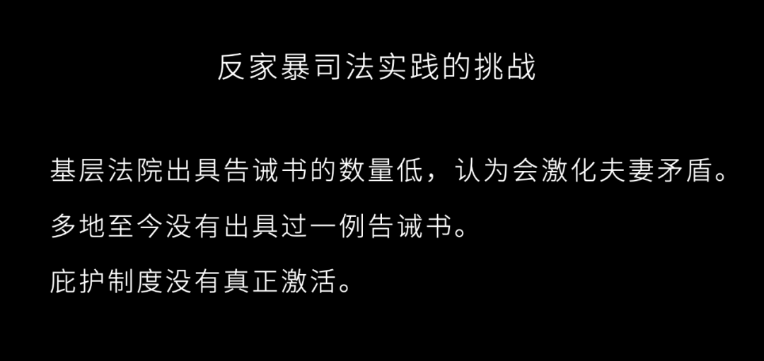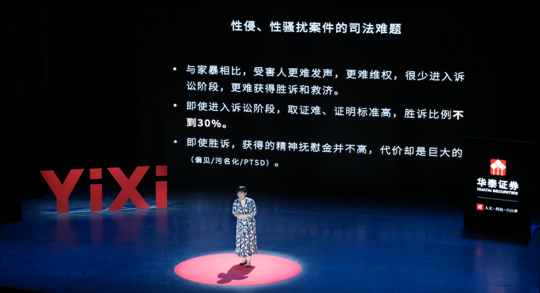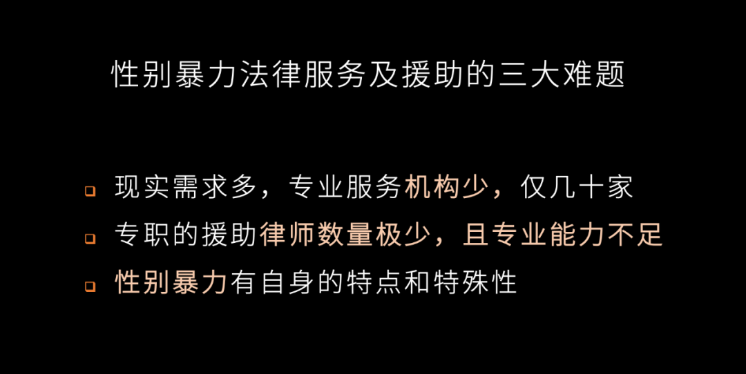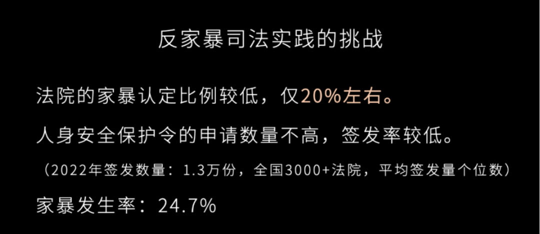 当海花听到5年有期徒刑的时候,一下子就跪在法庭上,失声痛哭。我知道这是她非常激动的眼泪,因为不久之后她就可以跟她的孩子团聚了(中国裁判文书网显示,海花已获减刑,服刑3年后出狱。现在她和四个孩子生活在一起)。这个案子也是我们国家适用《关于依法办理家庭暴力犯罪案件的意见》的首案,也因此入选了“中国反家庭暴力十大典型案例”。尽管我们国家有了《反家暴法》这样一个专门的法律,但是反家暴的司法实践还是面临诸多的挑战,比如:法院对家庭暴力的认定比例很低,仅20%左右;人身安全保护令的申请数量不高,签发率也较低。根据2022年最高法的统计数据,2022年人身安全保护令的签发率是过去4年的总和,但也仅仅有1.3万份,平均到全国3000家基层法院,每个法院的签发率是个位数。而与之相对应的是家庭暴力的高发生率。根据第三次中国妇女社会地位调查的数据,女性的家庭暴力发生率是24.7%。在美国,每7.4秒就有一位女性遭受家庭暴力。受家暴者的人数这么庞大,对应的却只有一点几万份的人身安全保护令签发量,不足是显而易见的。而且我们也看到,庇护制度并没有得到真正的激活。庇护制度是对严重家庭暴力受害人的一个有效的保护措施。虽然我们国家很多救助站都有庇护中心,但是因为门槛比较高,专业服务不足,接待时间比较短(只有10天),所以空置率很高,而它的需求量又很大。基层公安机关出具告诫书的数量也比较低。到现在为止,多地的基层派出所没有出具过一例告诫书。在我们源众代理的案件中,首个获得告诫书是在《反家暴法》实施5年后。家庭暴力的司法困境,事实上在性侵、性骚扰等性别暴力的案件当中也是存在的。我们办理的500多起案件中,约1/4涉及妇女儿童的性侵和性骚扰案件。这个数量看起来少,并不是说它的发生率低,而是与家暴相比,性侵、性骚扰的受害人更难发声、更难维权,也更难获得法律的救济。近些年,关于学校、职场的性骚扰似乎成为了一个公共话题,也成为了一个社会热点议题。但是我们会发现,职场性骚扰或者高校性骚扰进入诉讼阶段的案件非常少。而未能进入到诉讼阶段,就说明没有办法获得法律上的支持和救济。即使是进入到诉讼阶段,让受害人不安的是,由于跟家庭暴力一样存在举证难、证明标准高的困局,性骚扰案的胜诉率依然比较低,还不到30%。与之相对应的是,性骚扰的受害人可能会付出巨大的代价。比如会有来自社会的偏见和污名化,会有非常严重的PTSD症状,还会面临被迫辞职,甚至离婚和分手。这样困境反过来又会影响受害人的发声。![]()