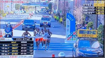 来到半程,第一集团用时1小时01分03秒,速度没有太大变化,此时领先世界纪录3秒。