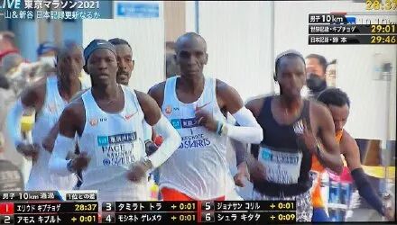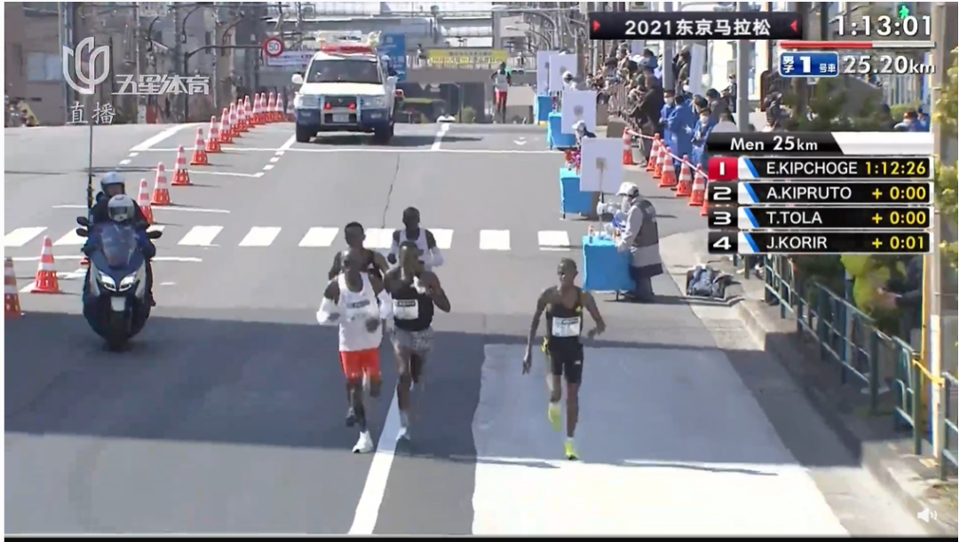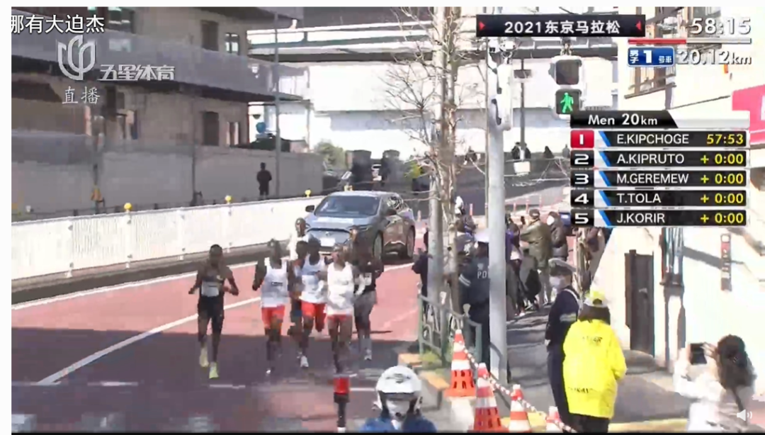 第一个5KM第一集团有6位选手跑在一起,5KM处基普乔格14:17领先第一,根据配速预计2小时03分完成比赛 ;第二集团几乎都是日本选手;