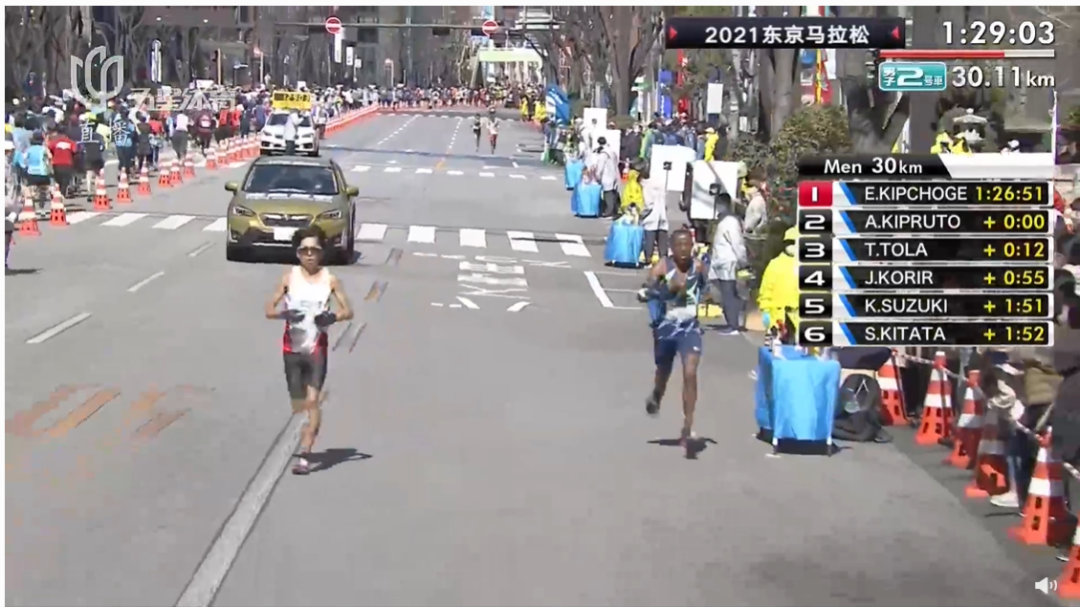 而铃木健吾在 30 公里的时候,超越 Kitata ,独自领跑日本选手,用时 1:43:35 , 2:04:45 的完赛节奏,比日本纪录快 11 秒。
