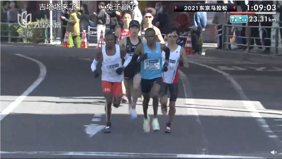 第二集团铃木健吾领先,再跟兔子沟通,看手势可能是觉得兔子配速有些慢,商量着是要领先跑了,看来是奔着PB去的;