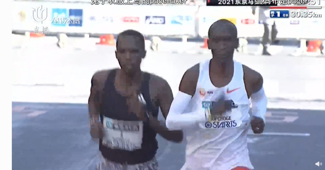 Kipruto紧跟其后,2人相差八岁, Kipruto采用很聪明、不违规的战术,始终跟在基普乔格其后甚至是贴着跟, 又是队友又是对手,基普乔格貌似很激动也很被动,想甩开 Kipruto,三番两次的掉头查看两人距离。