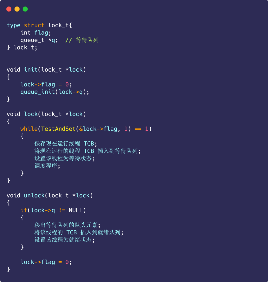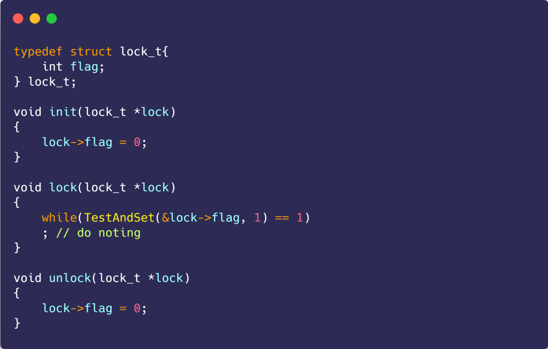 我们可以运用 Test-and-Set 指令来实现「忙等待锁」,代码如下: