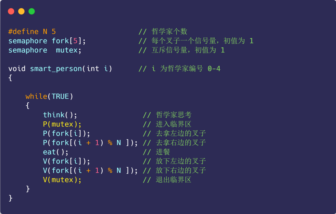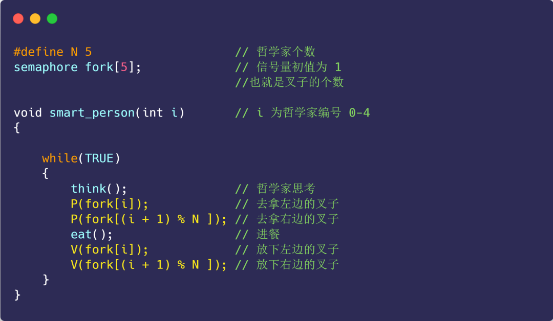 上面程序中的互斥信号量的作用就在于,只要有一个哲学家进入了「临界区」,也就是准备要拿叉子时,其他哲学家都不能动,只有这位哲学家用完叉子了,才能轮到下一个哲学家进餐。