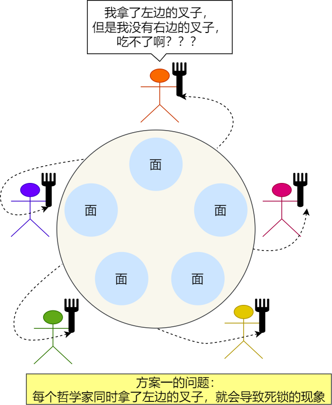 不过,这种解法存在一个极端的问题:假设五位哲学家同时拿起左边的叉子,桌面上就没有叉子了,