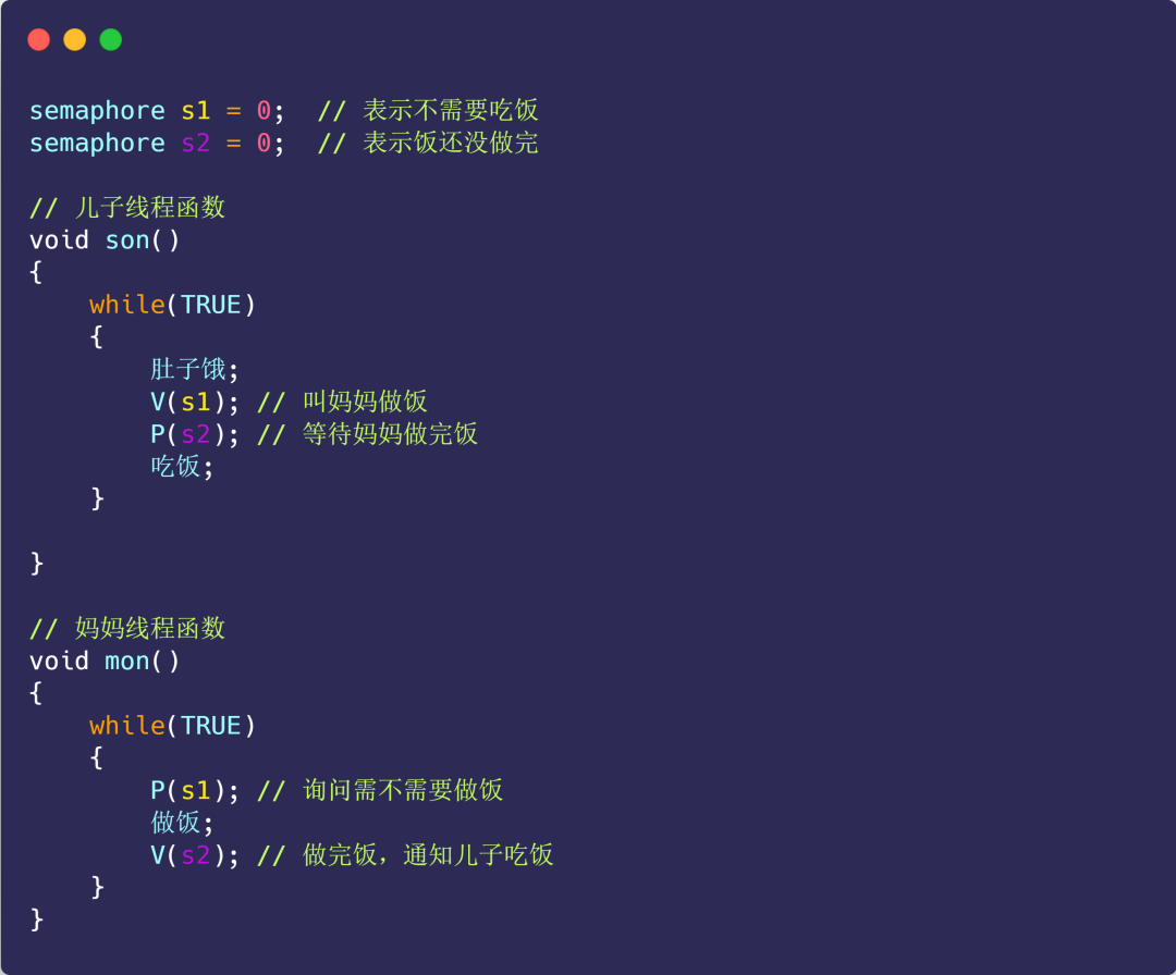 最后,妈妈终于做完饭了,于是执行 V(s2),s2 信号量从 -1 变回了 0,于是就唤醒等待中的儿子线程,唤醒后,儿子线程就可以进行吃饭了。