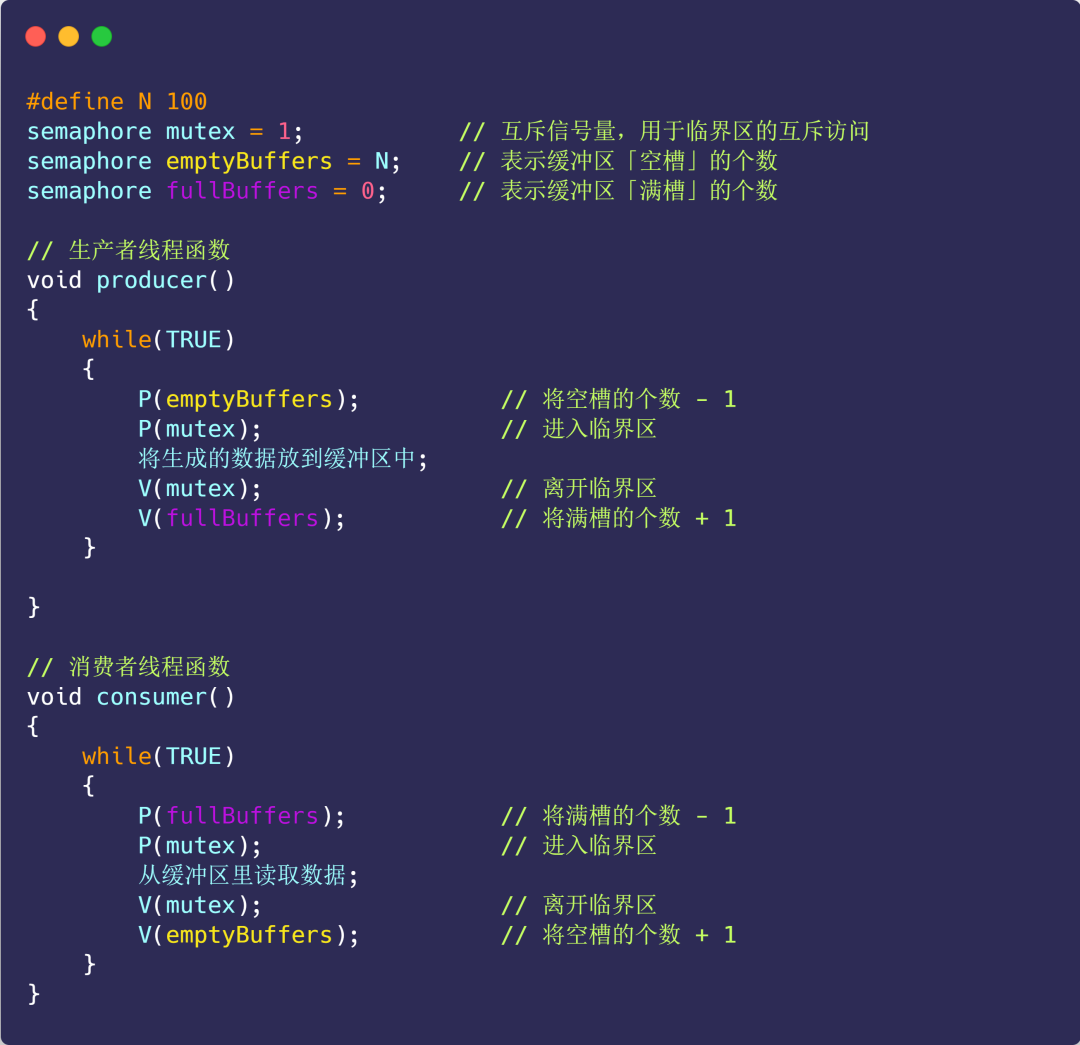 接着,轮到生产者执行 P(emptyBuffers),表示减少 1 个空槽,如果当前没有其他生产者线程在临界区执行代码,那么该生产者线程就可以把数据放到缓冲区,放完后,执行 V(fullBuffers) ,信号量 fullBuffers 从 -1 变成 0,表明有「消费者」线程正在阻塞等待数据,于是阻塞等待的消费者线程会被唤醒。