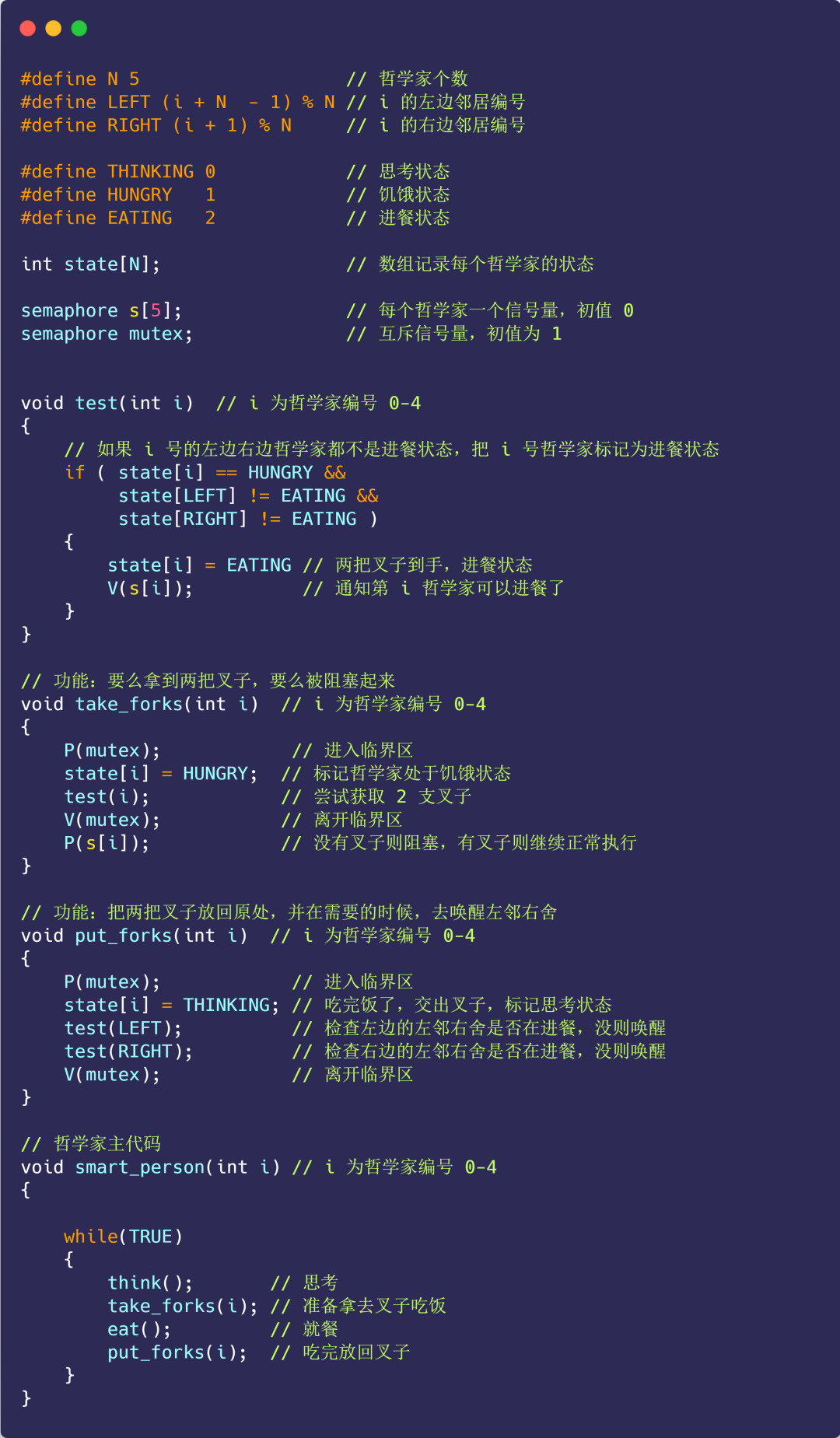 注意,每个进程/线程将 smart_person 函数作为主代码运行,而其他 take_forks、put_forks 和 test 只是普通的函数,而非单独的进程/线程。