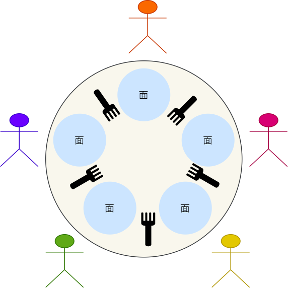 奇葩的是,这些哲学家要两支叉子才愿意吃面,也就是需要拿到左右两边的叉子才进餐;
