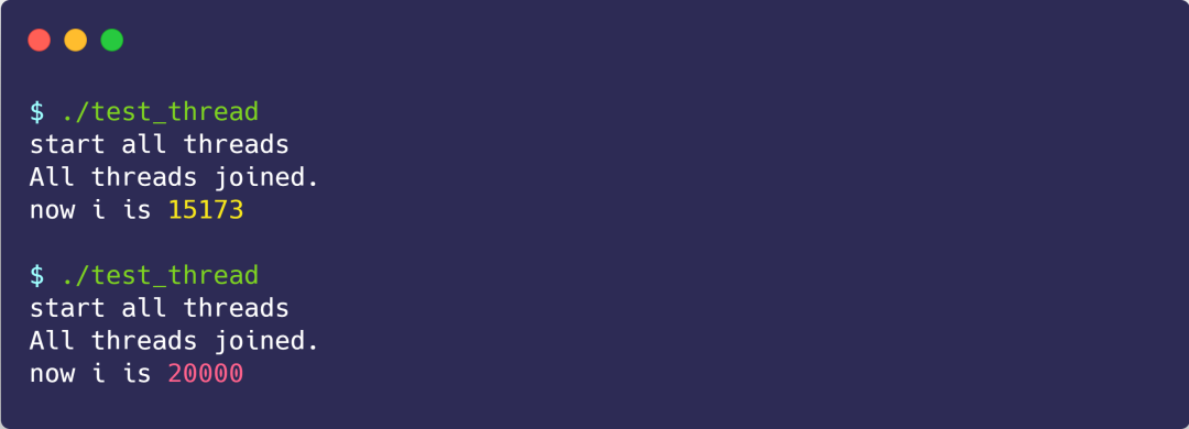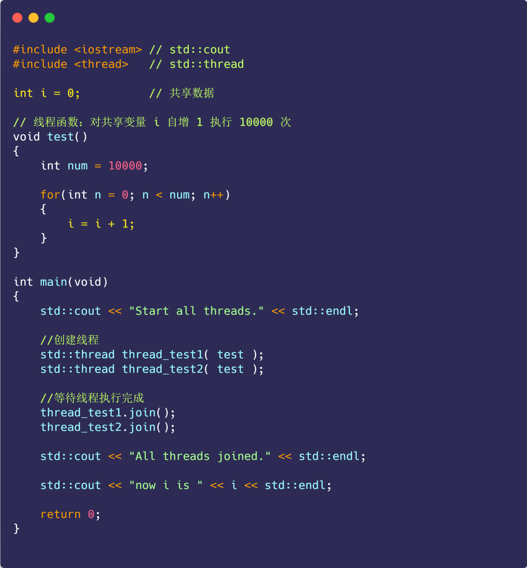 我们做个小实验,创建两个线程,它们分别对共享变量 i 自增 1 执行 10000 次,如下代码(虽然说是 C++ 代码,但是没学过 C++ 的同学也是看到懂的):