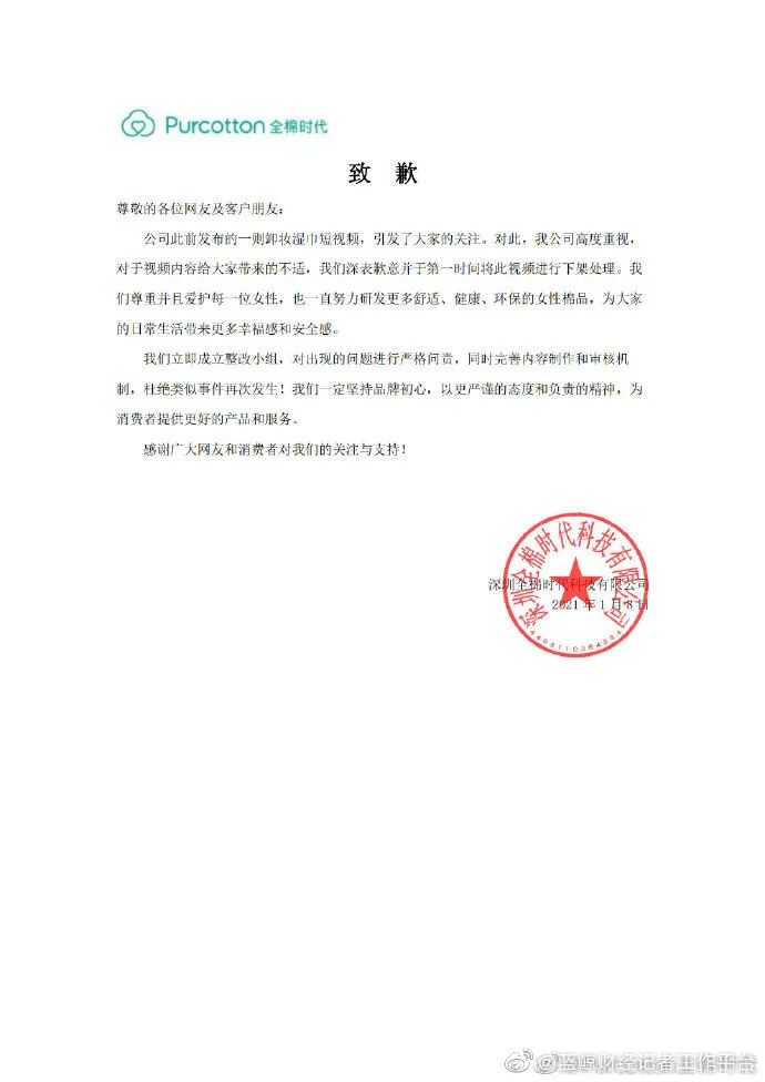 1月8日晚间,全棉时代在其官方微博发布声明再度致歉,就“广告涉嫌侮辱女性”再次致歉。全棉时代在致歉信声明表示,“我们立即成立整改小组,对出现的问题进行严格问责,同时完善内容制作和审核机制,杜绝此类事件再次发生。”
