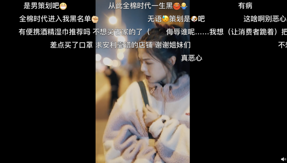 1月7日,全棉时代在社交媒体发布了一条标题为“全棉小剧场防身术”的广告,内容为一个漂亮女孩在深夜被尾随,她灵机一动,从包里掏出一盒全棉时代卸妆巾,迅速卸完妆后回头与歹徒对视,因为“太丑”而把歹徒吓跑。很多网友认为,这广告涉嫌侮辱女性,暗示女生妆前妆后差距过大。