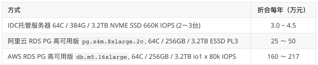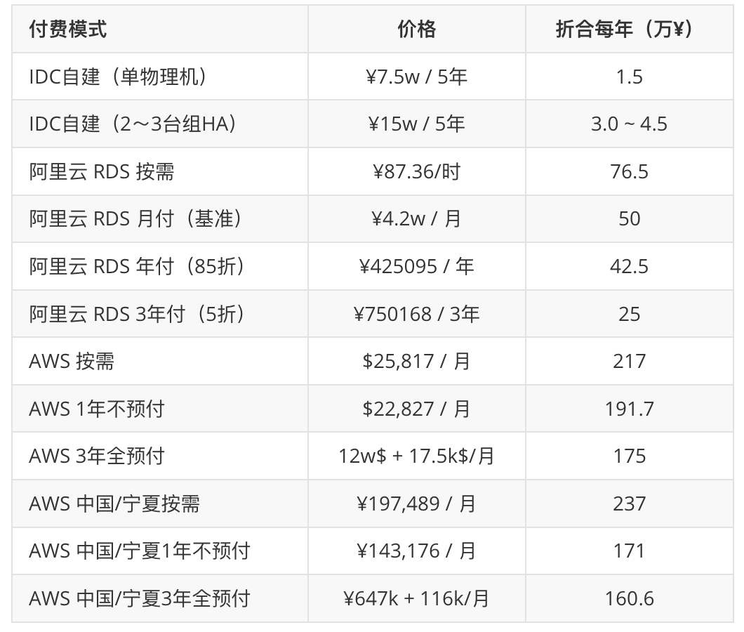 以 RDS for PostgreSQL 为例, AWS 上 64C / 256GB 的 db.m5.16xlarge RDS用一个月价格 $25,817 / 月,折合每月 18 万元人民币,一个月的租金够你把两台性能比这还要好的多得多的服务器直接买下来自建了。租售比甚至都不到一个月,租十来天就够你买下来整台服务器。