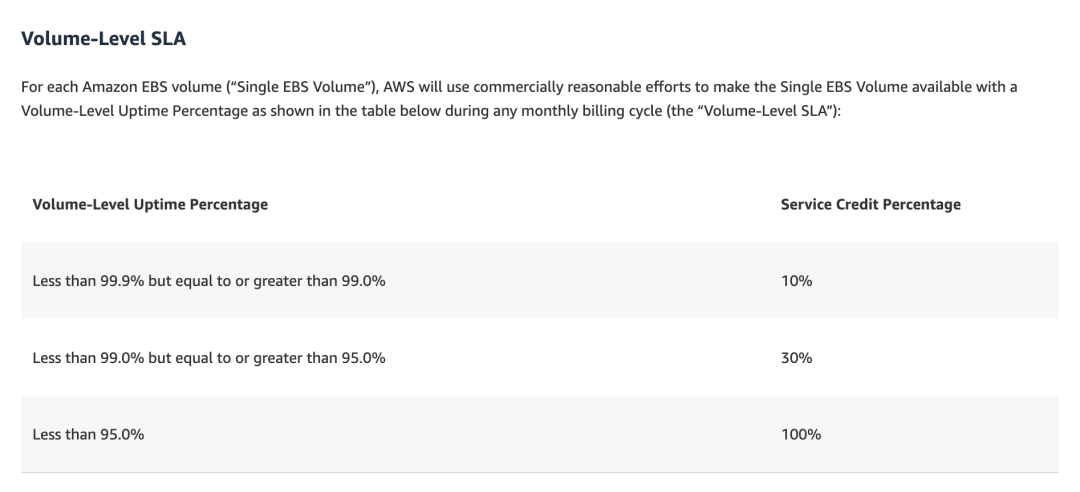 “专家”还会说,买“云服务”其实类似于买保险:“年化 0.02% 的故障看起来大部分人一次都遇不到,但是遇到一次就毁灭性的打击,而云厂商来为你兜底”。听上去好像很有吸引力,但翻开各家云厂商 EBS 的 SLA,你会发现压根没有为可靠性兜底的条款。ESSD 云盘介绍上是写了 9个9 的数据可靠性,但他也不敢把这句话写到 SLA 里。云厂商敢兜的只有可用性,而且还是相当逊的可用性,以 AWS EBS SLA 【9】为例: