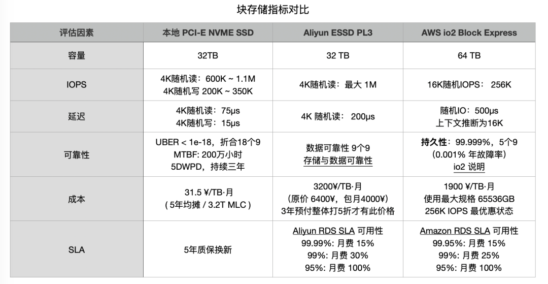 Aliyun ESSD PL3 和我们 IDC 自建采购 PCI-E NVMe SSD 【1】是同一家供应商。所以在最大容量和 IOPS 限制上都一模一样。AWS 最好的块存储 io2 Block Express 的规格和各类指标也基本类似。云厂商提供的最高端存储就是使用这种 32 TB 的单卡,所以才会有 32TB 最大容量的限制(AWS 64T),可以认为底下的实际硬件基本是高度一致的。