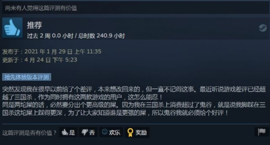 后面还出了更搞笑的瓜。前段时间《鬼谷八荒》因为创意工坊事件遭遇差评轰炸,却让《三国杀》玩家感到危机——不允许有游戏比我们还烂。为了捍卫差评之王的尊严,他们自发跑去《鬼谷八荒》评论区刷好评,上演了一出围魏救赵的好戏。